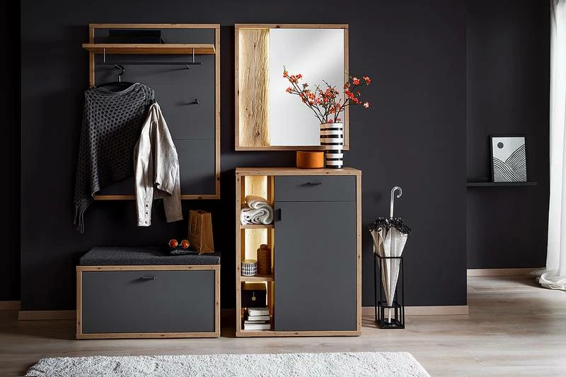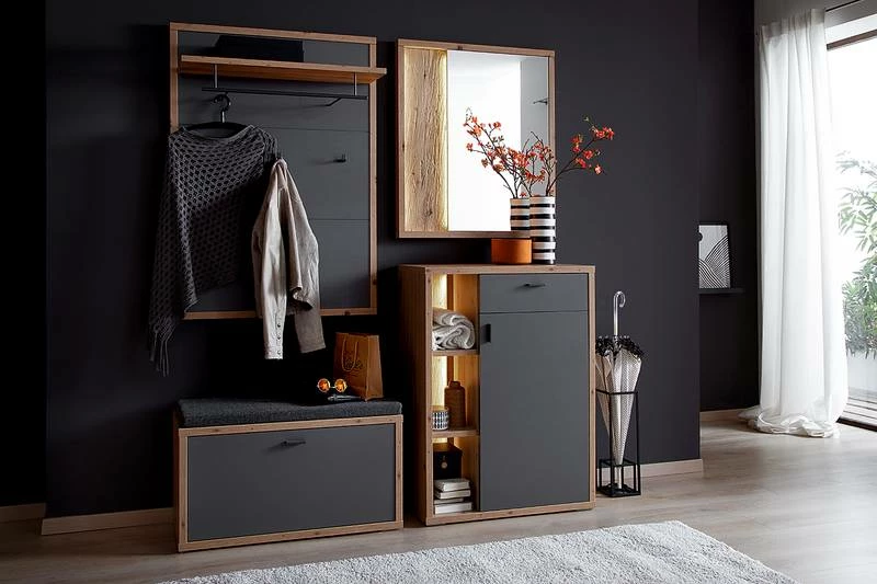 - Contenu de la livraison : Ensemble d’entrée comprenant 1 porte-manteau mural, 1 banc d’entrée, 1 miroir et 1 meuble d’entrée, sans éclairage ni accessoires